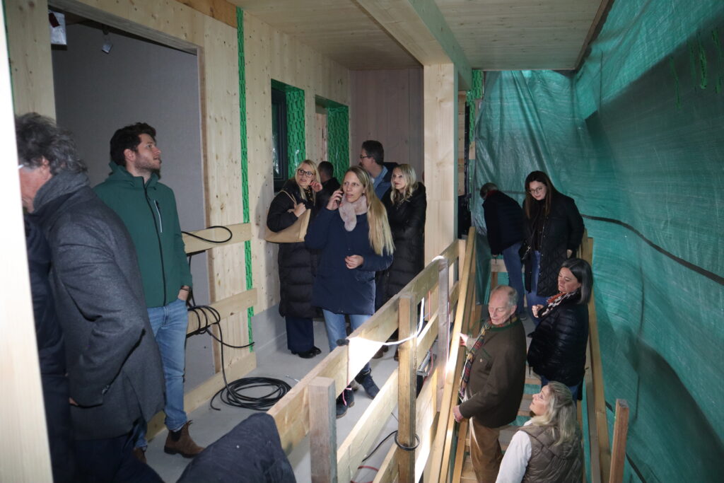Die Gäste zeigten sich begeistert vom Fortschritt und der Klarheit, mit der sich das Gebäude in der Seegasse bereits jetzt abzeichnet. Die einfache, aber kraftvolle Architektur, die massiven Holzwände, die präzise Modulbauweise – all das wurde bei der Besichtigung greifbar.